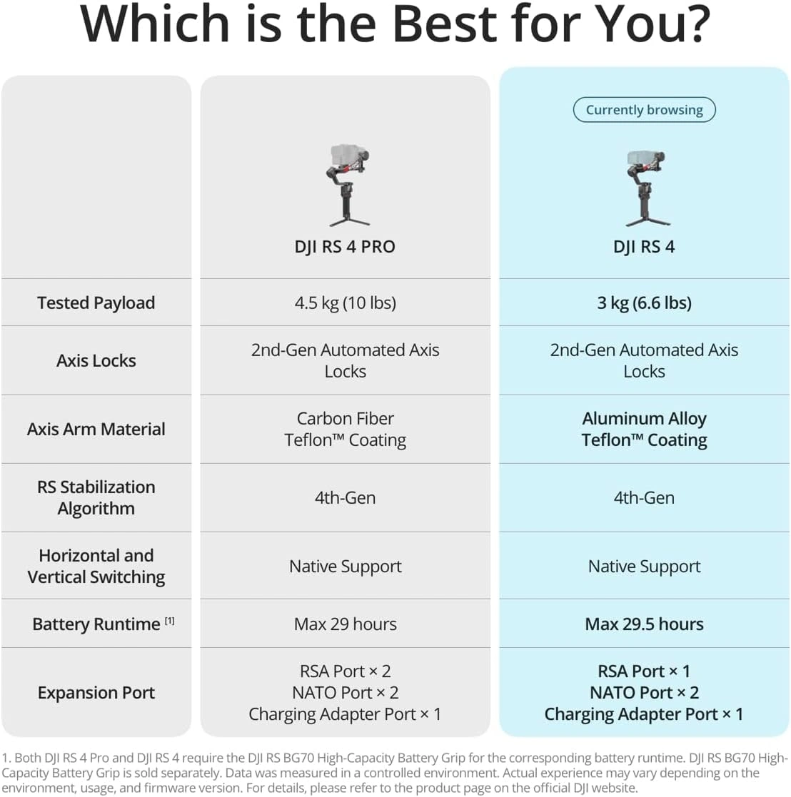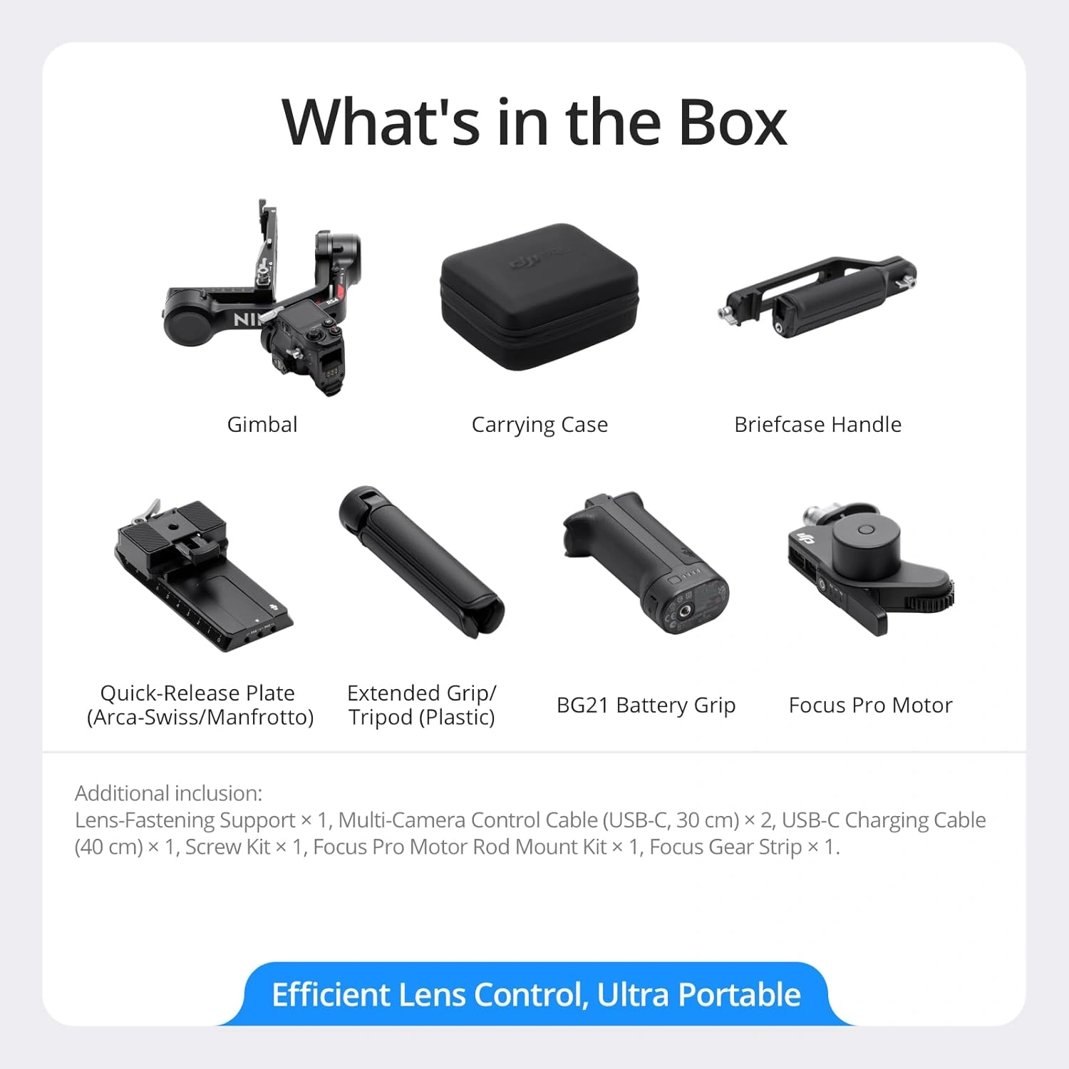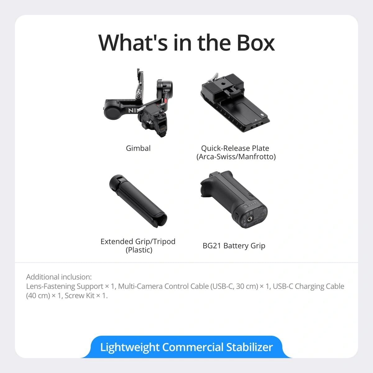 | Weight | Gimbal: Approx. 1066 g (2.35 lbs) Grip: Approx. 203 g (0.45 lbs) Extended Grip/Tripod (Plastic): Approx. 183 g (0.4 lbs) Upper and Lower Quick-Release Plates: Approx. 98 g (0.22 lbs) |